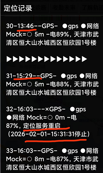 而31-33之间,出现了32(写明定位服务重启,并记录什么时间停止运行了),这表示在这个时间,定位服务被杀。